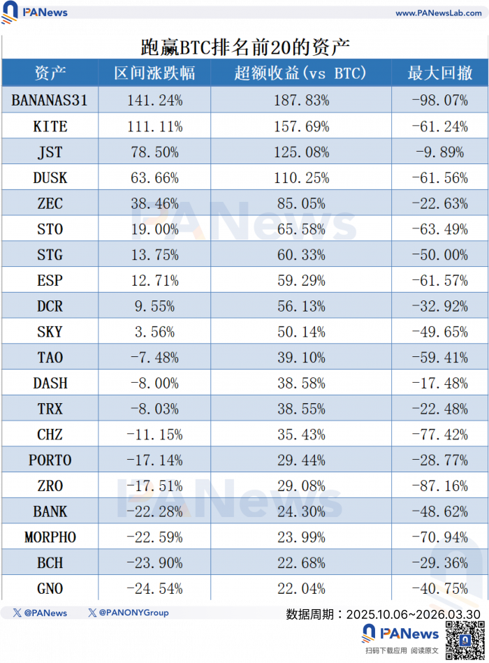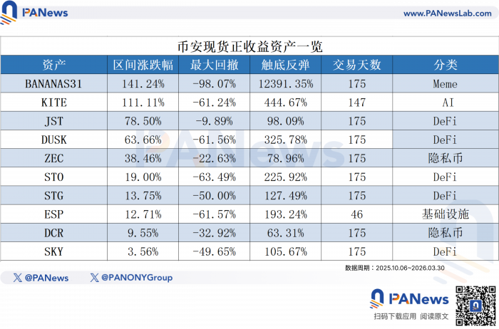 先看完整名单。在BTC腰斩、全市场血流成河的六个月里,币安现货上能录得正收益的资产如下: