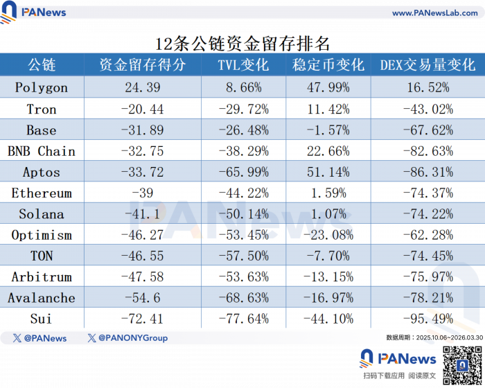 如果说代币价格反映的是市场情绪,那链上数据反映的就是生态的真实健康状况。PANews从资金留存(TVL、稳定币、DEX交易量)和用户活跃度(日活地址数)两个维度,对12条主要公链做了一次全面体检。通过对各维度变化率等权平均,没有做加权方法做了一套评分标准。