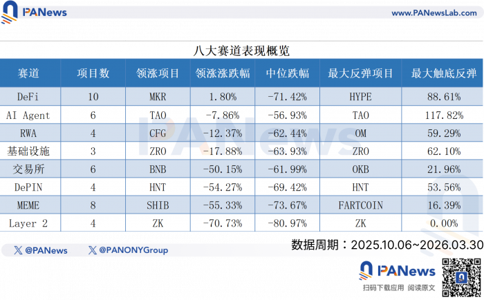 (本文分析范围:研究区间为2025年10月6日至2026年3月30日。币安现货424对为去重后剔除稳定币、法币锚定和杠杆代币的有效样本。链上数据来自DefiLlama、growthepie和Token Terminal。赛道项目价格取币安价格及CoinGecko。)