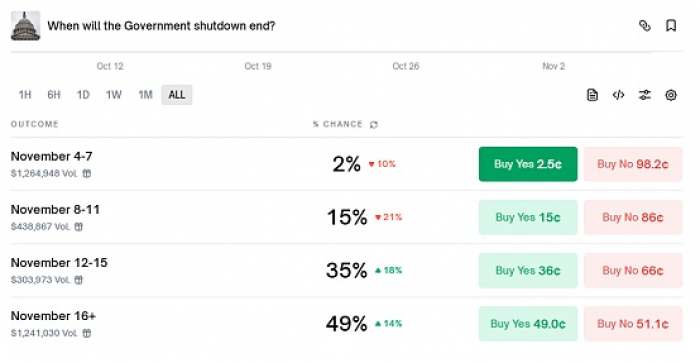 而从预测市场而言,针对美国政府何时结束停摆,约有过半概率认为在11月16日之后。机构的预测也有类似之处,未来两周是关键时期。高盛预计,政府停摆最有可能在11月第二周结束,其表示10月28日与11月10日空管和机场安检人员工资将中断,而美国联邦航空管理局提出,除非停摆到本周五结束,否则将从周五开始削减40个机场10%的空中交通量,这一因素也正是上一次停摆结束的原因。另一机构花旗也表示有信心政府关门将在未来两周内结束。