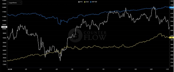 今年来标普500、黄金、比特币的价格走势,来源:Counterflow