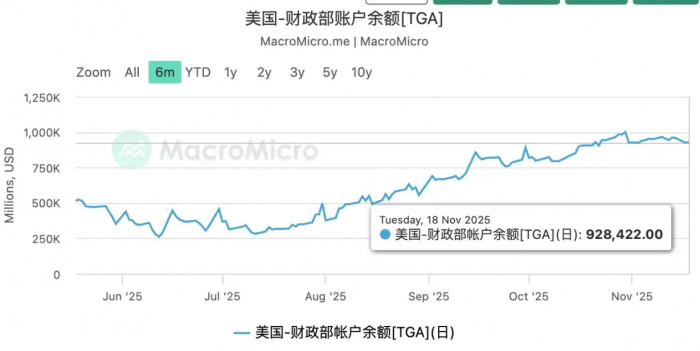 数据显示,从 2025 年 10 月 1 日至 11 月 12 日这 43 天期间,TGA 余额持续累积,到 11 月 14 日达到 9590 亿美元的高点。这个水平远高于财政部通常维持的现金部位,主要是因为政府停摆期间支出受限,加上持续发债筹资,导致现金大量累积在国库账户中。