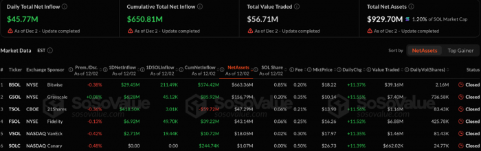 SOL的催产产品于10月28日上市,虽然上市以来SOL价格持续下跌约31%,但资金却呈现出越跌越买的逆势流入流入。截至12月2日,整个SOL ETF板块累计净流入高达6.18亿美元,总资产达到9.15亿美元,占SOL总市值的1.15%。在不到两个月的时间里取得如此规模,一定程度上说明市场对SOL作为“第三大公链”定位的广泛认可。