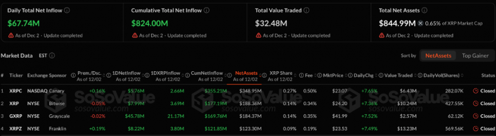 XRP ETF于2025年11月13日陆续开始上线,同期XRP价格下跌约9%。与SOL一样,XRP ETF也呈现越跌越买的趋势。大约12月2日,累计净流入8.24亿美元,总资产价值约8.44亿美元,占XRP总市值的0.65%。近期发行商在XRP ETF产品中的规模差距出现了明显拉开,多个机构出现了相关的市场份额。