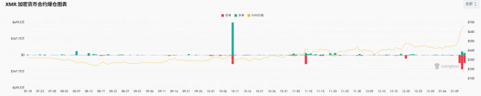 在合约方面,情况也类似。成交量的高点同样出现在11月10日。随后直到最近一周前,合约交易量并未出现明显的大涨,甚至还有些下滑的迹象。观察持仓量数据,其以美元计价的变化曲线几乎和价格走势完全重叠,市场上的XMR持仓数量并未出现异常激增,持仓额的上升仅仅是因为币价涨了,而非大规模新资金入场开仓。