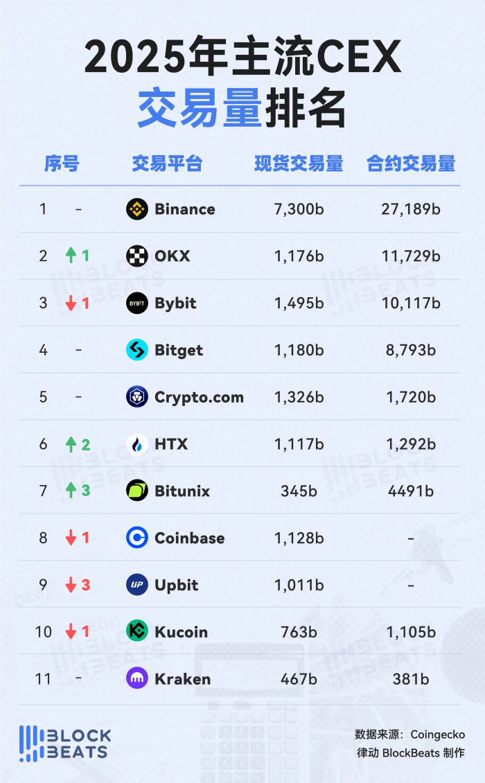 2025年交易平台排行榜:CEX现货交易量小幅上升,Binance仍居绝对领先地位