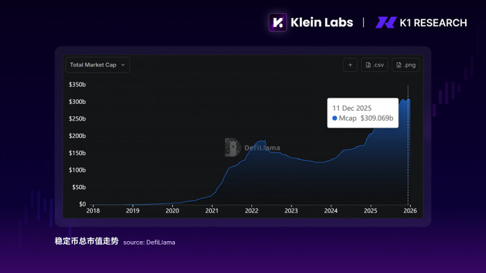 稳定币在这一过程中扮演了与以往周期完全不同的角色。过去,稳定币更多被视为交易所内部的“中介货币”或牛市中的杠杆燃料,其增长往往与投机活动高度相关。而在 2025 年,稳定币逐步演化为资金停留与结算工具。稳定币总市值从年初约 2000 亿美元增长至年末 3000 亿美元以上,全年增量接近 1000 亿美元,但同期山寨资产整体市值并未同步扩张。与此同时,稳定币年度链上结算规模达到数万亿美元量级,甚至在名义口径上超过传统卡组织的年交易规模。由此可见,2025年稳定币增长主要来自支付、清算与资金管理需求,而非投机杠杆。