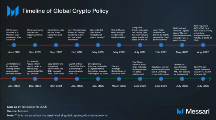 在过往周期中,监管更多以负面方式介入市场:要么在行情高点通过禁令、调查或执法打断风险偏好,要么在熊市中以追责形式集中释放不确定性。这种模式下,政策往往既无法有效保护投资者,也难以为行业提供长期发展预期,反而加剧了周期的剧烈波动。而进入 2025 年,这一治理方式开始发生结构性变化:行政令先行、监管机构口径趋同、立法框架逐步推进,逐步取代此前以个案执法为主的监管模式。