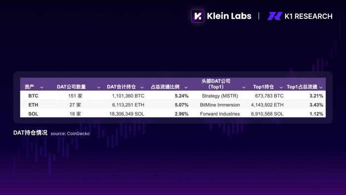 与 ETF 同样值得关注的,是2025年迅速兴起的 “币股公司”DAT(Digital Asset Treasury Companies)现象:上市公司将 BTC、ETH 乃至 SOL 等数字资产纳入资产负债表,并通过增发、发行可转债、回购与质押收益等资本市场工具,把股票塑造成“可融资、可加杠杆的加密敞口载体”。从规模看,已有将近200家公司披露采用类似 DAT 的策略,合计持有数字资产超过 1300 亿美元,DAT 已从个案演化为一类可被追踪的资本市场结构。DAT 的结构性意义在于:它与 ETF 一样强化了主流资产的资金吸附,但传导机制更“股权化”——资金进入的是股票估值与融资循环,而非直接进入长尾代币的二级流动性,从而进一步加剧了主流资产与山寨资产之间的资金分层。