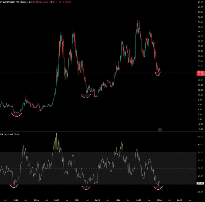 2025 年底到现在,我们第四次见证了这一历史性的超卖信号。黄金在 2025 年暴涨 64%,而比特币相对黄金的 RSI 再次跌入超卖区间。