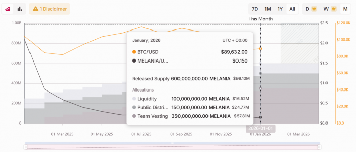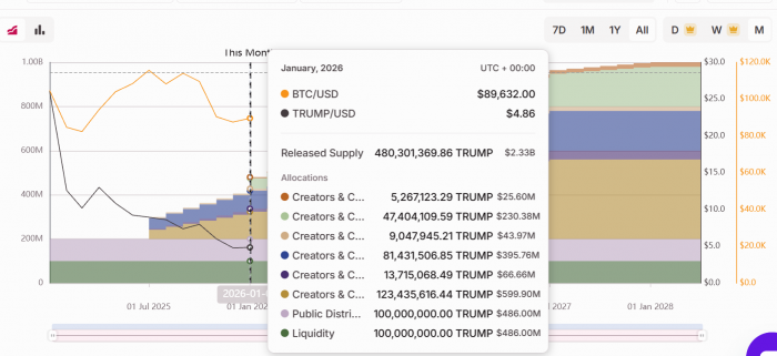 MELANIA 则由第一夫人梅拉尼娅旗下的佛罗里达注册公司 MKT World LLC 负责营销。总量同样为 10 亿枚,目前已解锁约 6 亿,其中团队份额 3.5 亿,按现价约合 5780 万美元。