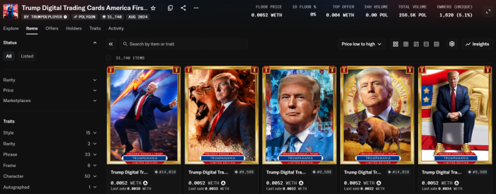2024 年 8 月,特朗普再次推出系列 4,单张价格仍为 99 美元,但是总数达到了离谱的 36 万张。不过这一次,市场吃不消了。Opensea 数据显示,该系列出售总数约为 3.2 万张,获利约 318 万美元。
