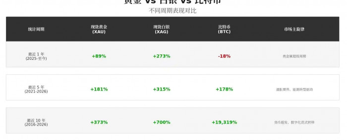 如果从长期视角看,比特币依然是回报最高的资产之一。但放到过去一年,比特币的表现却明显落后于黄金和白银。2025 年至 2026 年初的市场走势呈现出极为鲜明的二元分化特征,贵金属市场步入了一个被称为」超级周期」的阶段,而比特币略显颓势。下面是三个关键周期的对比数据: