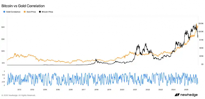 第一,比特币与黄金的联动,从一开始就不是避险共振。比特币早期还处于极客圈子的起步阶段,当时市值和关注度都微乎其微。2013 年塞浦路斯爆发银行业危机,部分资本管制措施实施,黄金价格却从高位大幅回落约 15%;同期比特币飙升至超过 1000 美元。这被一些人解读为资本外逃和避险资金涌入比特币,然而事后来看,2013 年的比特币疯涨更多是由投机和早期情绪驱动,其避险属性并未得到广泛认同。当年黄金大跌、比特币大涨,两者相关性也很低——月度收益率相关性仅 0.08,几乎为零。
