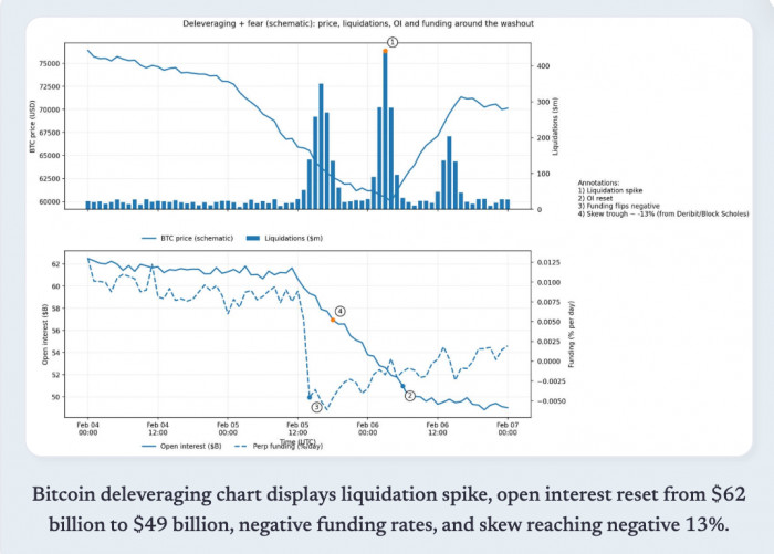比特币去杠杆图表,显示了清算激增、持仓量从 620 亿美元重置至 490 亿美元、负资金费率以及偏度触及 -13%。