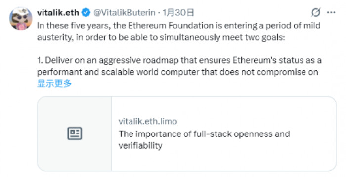 Vitalik 本次资金变动计划已提前公布。1 月 30 日,Vitalik 通过 X 个人账号发布长文,宣布将从个人钱包提取 16,384 ETH(当时价值约 4400 万美元),并逐步变现。