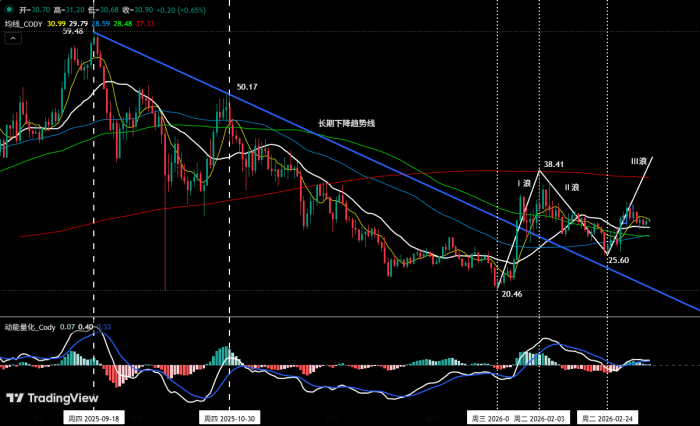 • Ⅱ浪(调整浪):自 2 月 3 日高点 38.41 美元至 2 月 24 日低点 25.60 美元,历时 20 天,期间最大跌幅为 33.35%。