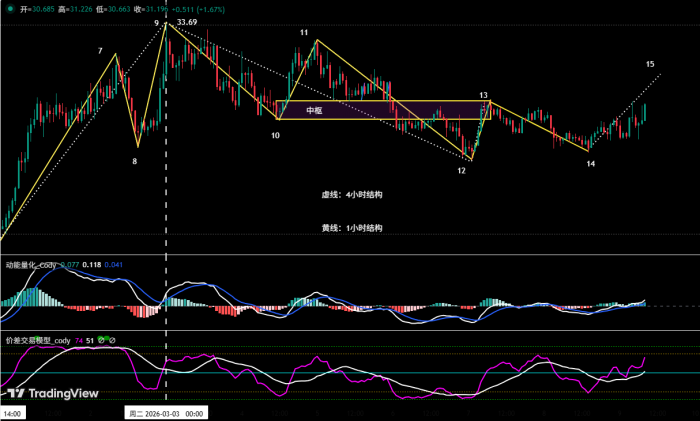 • 调整拐点形成及成立判断:在(图二)中显示,进入段与离开段相比已经形成背驰信号,因此我们认为本轮调整在端点 12 处结束概率大。如果自端点 12 启动的上涨行情,首先有效站稳31.5 美元阻力位,然后再突破32.75 美元局部前高,则本轮调整结束,开启新一轮上涨的概率将大增。(特别强调:HYPE 后续出现的调整不应低于端点 12 的价格(约29.44 美元),否则上述结论不成立,本轮调整拐点将后移)