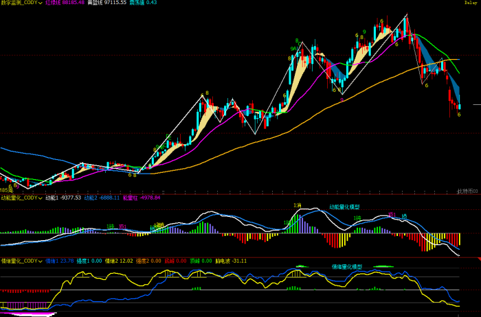 比特币日 K 线图:(动能量化模型+情绪量化模型)