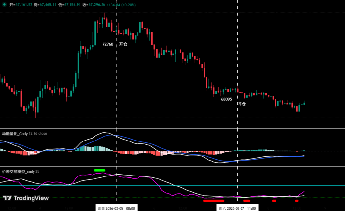 • 平仓:跌至68,000 美元附近,叠加价差交易模型触发底部预警信号(图中红点),于68,095 美元附近全部清仓。