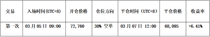 • 开仓:反弹至重要阻力位 74,500 美元附近承压遇阻,同时价差交易模型触发顶部预警信号(图中绿点),再叠加两大模型沽空共振信号,于72,760 美元建立30%空头仓位。