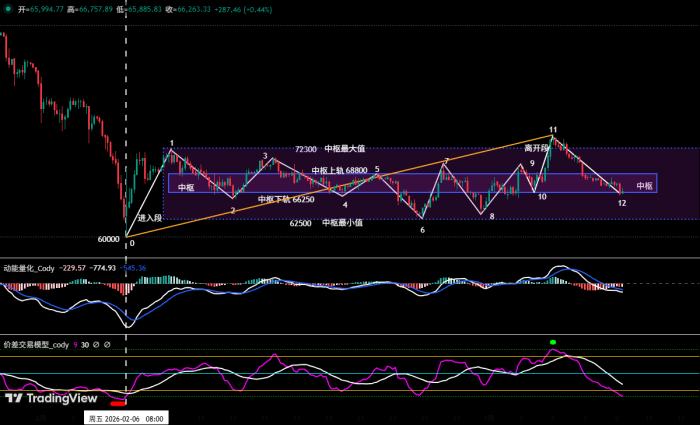 • 中枢构筑:从(图六)中看到:目前“上涨中枢”结构基本形成。其最高阻力位约72,300 美元附近,最低支撑位约62,500 美元附近;中枢上轨约68,800 美元,中枢下轨约66,250 美元。