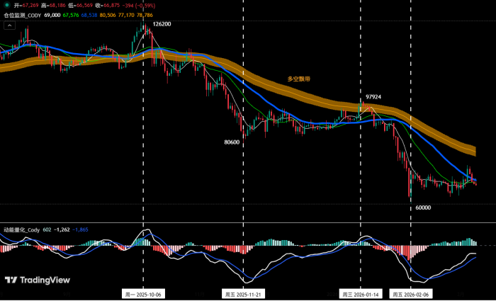 中线策略:继续持有于89,000 美元附近(1 月 28 日)建仓的60%空单,截止上周盘后(收盘价约65,971 美元)盈利约 25.88%。