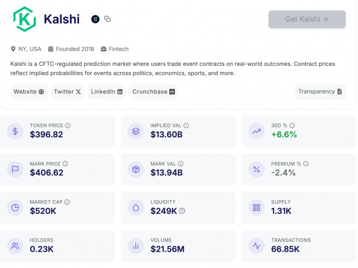 PreStocks 平台,股票代币盘前价格为 397 美元左右;(相较于我们 1 个月前在《Kalshi 交易量续破新高,盘前股价多少合理?》一文中的 369 美元已增长近 30 美元,涨幅达 7.6%)