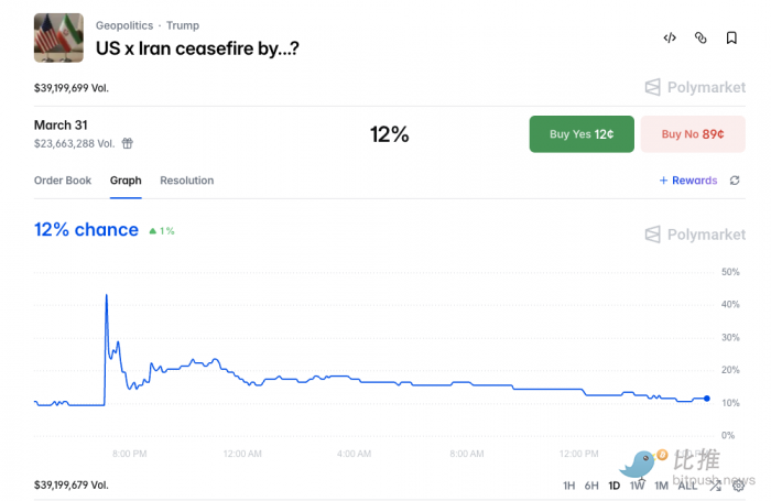遇上特朗普这样的高手,即使连号称能走在事件真相前面的预测市场也会被耍的团团转。据Odaily Seer 先知频道监测,在特朗普发文称美伊对话取得良好进展后, Polymarket 上“美国与伊朗将于 3 月 31 日前停火”事件概率快速上升至 54%,而被发现是一场闹剧后,该事件概率又迅速跌回 16%,目前已跌至 12%。