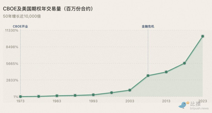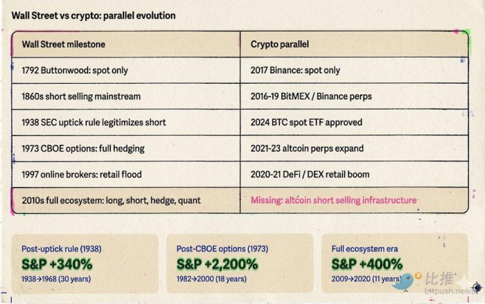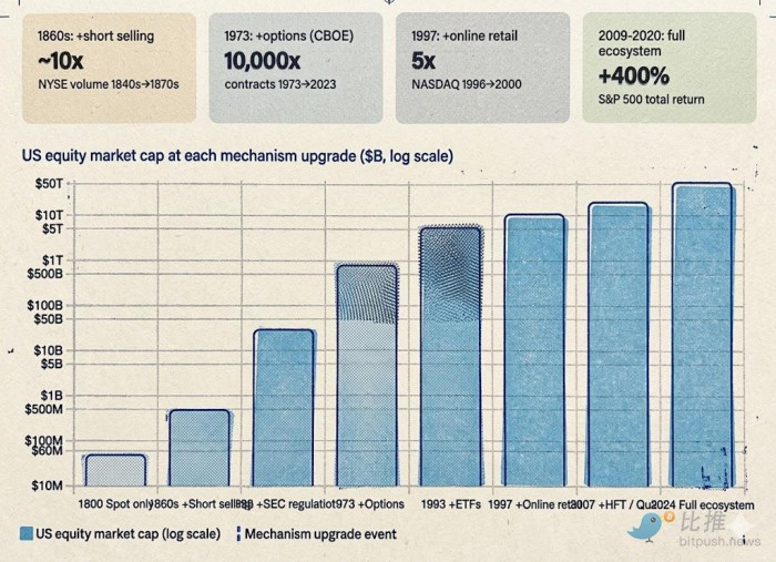 1860 年代做空普及后,NYSE 交易量十年增长十倍,华尔街从小圈子变成真正的资本市场。1938 年 uptick rule 合法化做空后,机构资金大规模入场,S&P 500 在随后 30 年里上涨 340%。1973 年 CBOE 期权诞生后,期权交易量 50 年增长 10000 倍,美股迎来数十年的持续扩张。2019 年 BTC 永续合约上线后,BTC 波动率从 150% 降到 50%,市值却从 100 亿美元膨胀到 2 万亿。