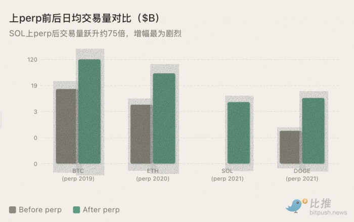规律继续成立:BTC 有了 perp 迎来大牛市,ETH 也是,SOL 也是,每个上了 perp 的山寨币都经历了流动性跃迁。