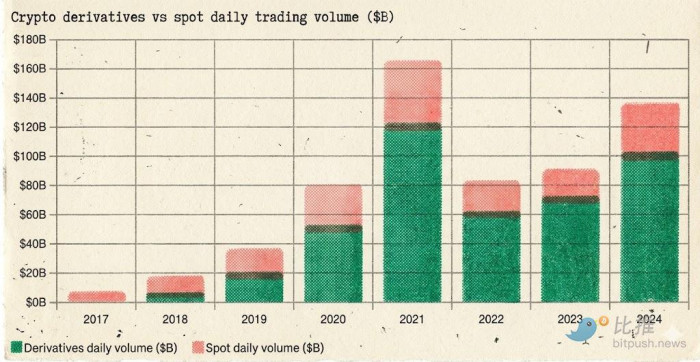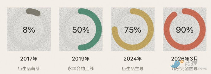 衍生品占总交易量比例从 2017 年的不到 10% 上升到 2026 年 3 月的约 90%——衍生品已经彻底主导了加密市场的定价权: