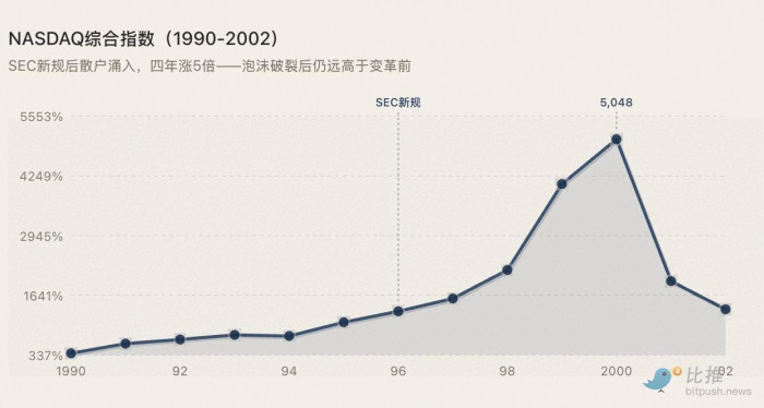 泡沫最终破了,但 NASDAQ 的市值在泡沫之后依然远高于变革之前——因为基础设施升级带来的参与者增量是不可逆的。