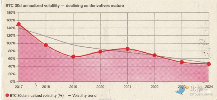 BTC 的 30 日年化波动率从 2017 年牛市期间的 150% 以上,降到 2020-2021 年牛市期间的 60-90%——涨幅更大了,但波动更有序了。暴涨暴跌依然有,但「无量阴跌三个月」的情况明显减少了,因为空头到了一定价位会回补,形成自然支撑。