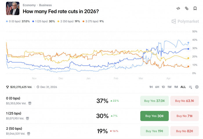 此外,据 Polymarket 最新数据显示,市场押注今年美联储降息 1 次的概率已升至 30%。