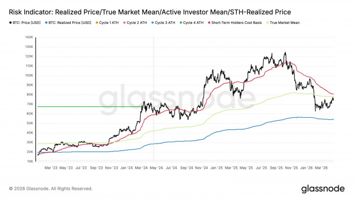 然而,过高的已实现利润与低迷的波动率释放谨慎信号,且 8 万美元附近的上行空间面临阻力。